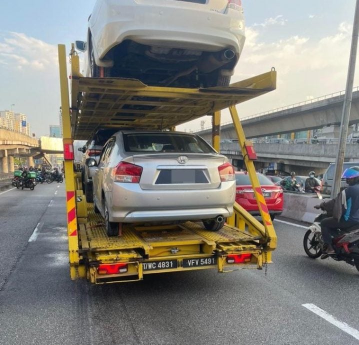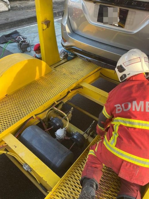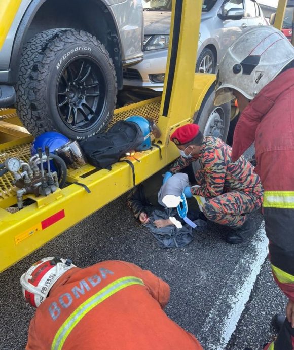(八打灵再也12日讯)车与运载轿车的拖格发生,女骑士卡在罗里底下,被消防与拯救队救出后,发现她只受,真是