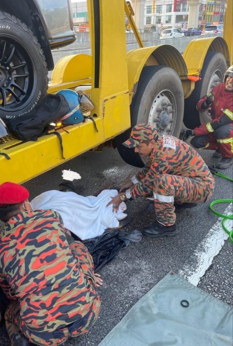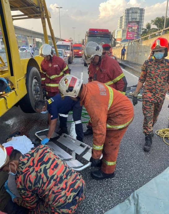 雪州消拯局发文告说,该局下午5时26分接获投报后,调动1辆消防车及6名消拯员到场施援,证实1名约30岁的巫裔女骑士,车祸发生后卡在罗里车底下。