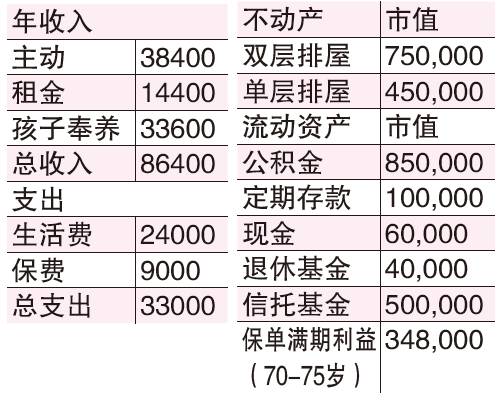 保险:储蓄保险,有5份(分别是7万5000令吉、7万5000令吉、6万8000令吉、8万令吉和5万令吉),全部已供完,70-85岁可以拿。