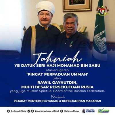 莫哈末沙布今日在官方脸书撰文说,俄罗斯联邦宗教司兼穆斯林领袖精神委员会主席拉维尔盖尼特丁,是在今日(当地时间5月16日)颁授上述勋章。