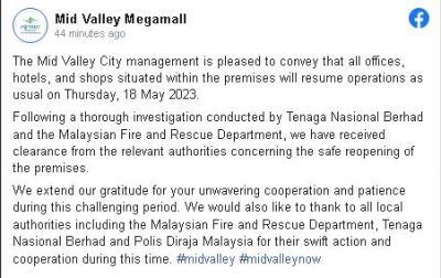 (吉隆坡17日讯)在扑灭火势并经过严谨的调查后,谷中城购物广场今午宣布,该购物广场将于明日(18日)恢复正常营业。