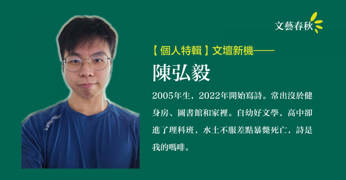 陈弘毅,2005年生,22年开始写诗。常出没于健身房、图书馆和家里。自幼好文学,高中却进了理科班,水土不服差点暴毙死亡,诗是我的吗啡。会对电影角色表示“天啊这根本是我”。