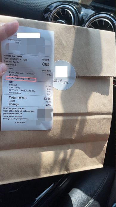她说,自己购买的牛角包售价9令吉,她最后却支付了12令吉55仙,重看单据后才发现除了销售与服务税(SST),原来店家还征收了1令吉80仙的“打包”费用。