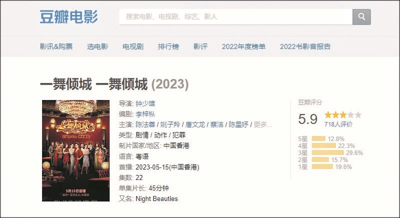 此外,无线昨天公布《一舞倾城》第3周收视,香港最高收视20.4 点(131万观众),比上周升1.3点;《一舞倾城》在中国豆瓣网的评分为5.9,虽然初时被形容为港版《华灯初上》,但网民指此剧只能是“胶版”《华灯初上》,形容剧集只有“过时味”而非“怀旧味”,并批剧中用太多滤镜。