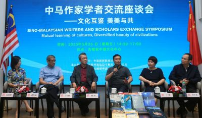 由中国国家新闻出版署主办,中国图书进出口(集团)有限公司承办,吉隆坡中国文化中心协办的中马作家学者交流座谈会于5月26日圆满召开。左起为主持人伍燕翎博士、黄先炳博士、许友彬、薛涛、丁墨和刘育龙。
