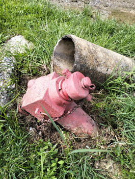 一天,走在巷子小路上,发现道旁水迹斑斑形成小小的溪流,低洼处积着水,几只小麻雀叽叽喳喳正在戏水呢。拨开路边野草,发现邻居华叔家的篱笆旁竟然有一口救火栓!因为久远疏于照顾,救火水龙头深陷泥沼里,露出短短一截锈迹斑斑,依稀可辨认的水龙头和一段紧缠着的生锈铁链。水龙头仿佛发出无声的呼救,请我们放它出来,让它能够在紧急时发挥功能。