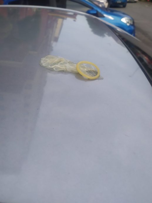 (八打灵再也10日讯)一名女子在上班前,发现自己的汽车车顶有一个用过的保险套,让她直呼恶心又倒霉,一整天的好心情被破坏了。