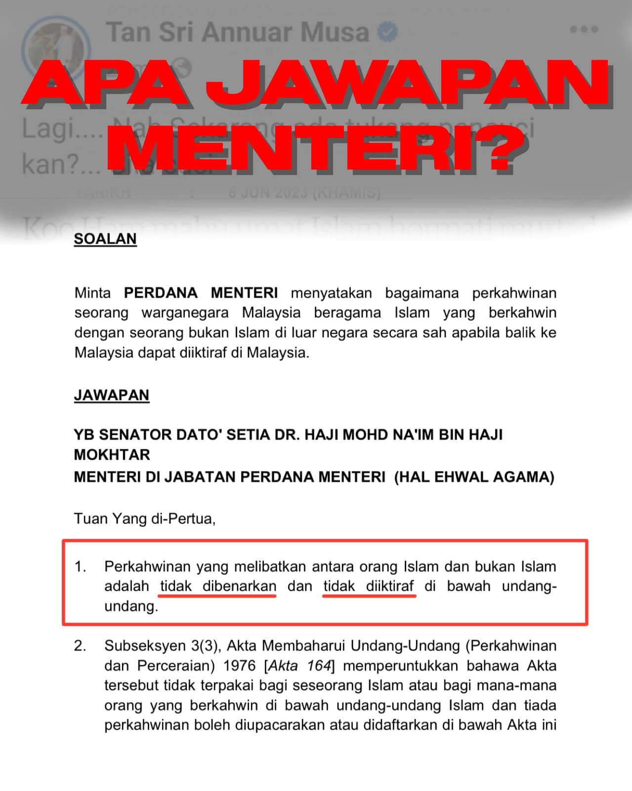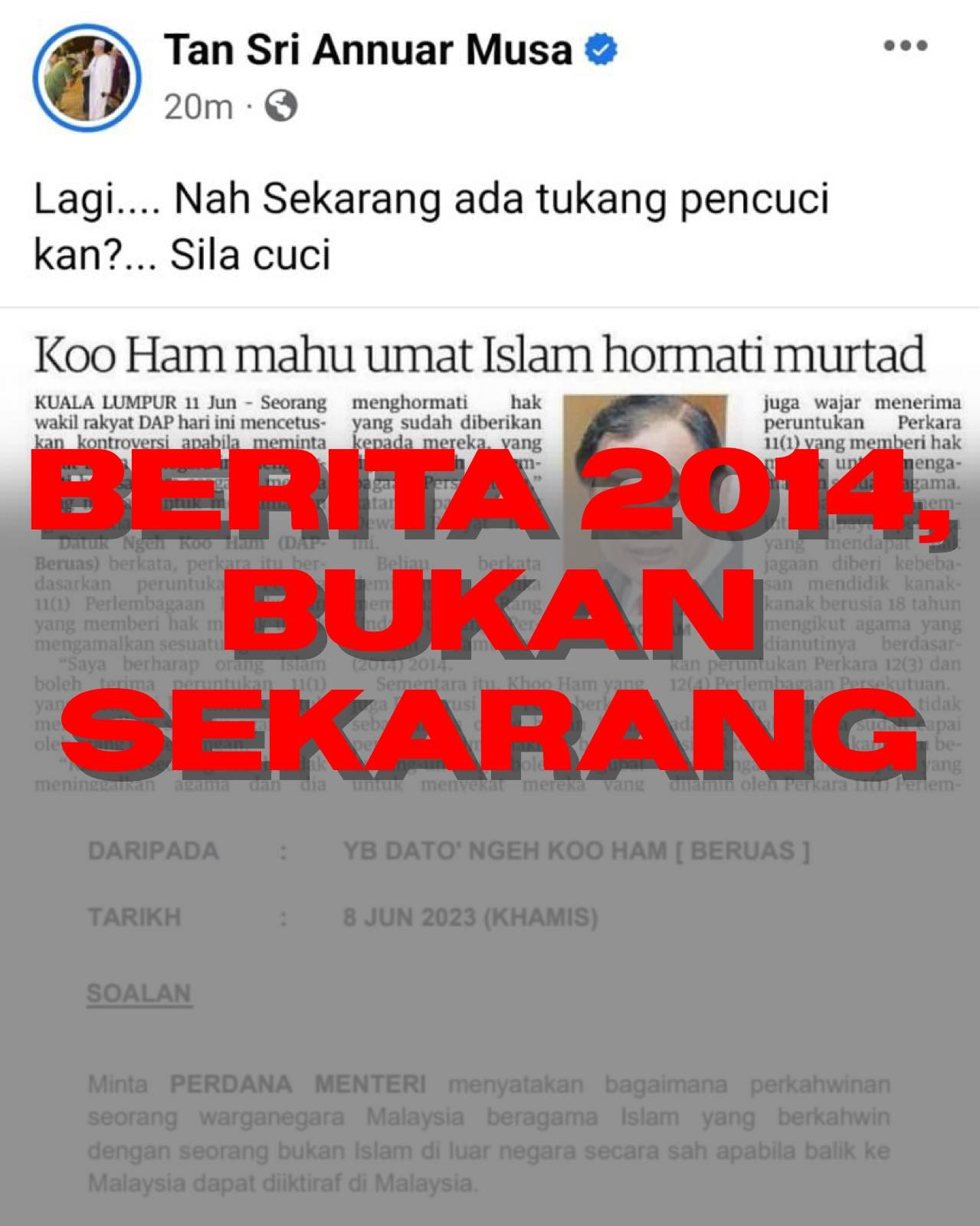 法米今日在脸书上”打假“的资讯,是社交媒体上流传题为”倪可汉要求穆斯林尊重叛教徒(Murtad)“的新闻,以及向首相署部长(宗教事务)提问,穆斯林与非穆斯林在国外合法结婚,回到大马后是否被政府承认的国会书面回答文件。