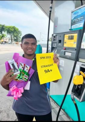 (八打灵再也14日讯)一名学生2022年大马教育文凭(SPM)考试中考获“9A+”的优异成绩,其打工的添油站老板从日本买来“豪礼”作为奖励。