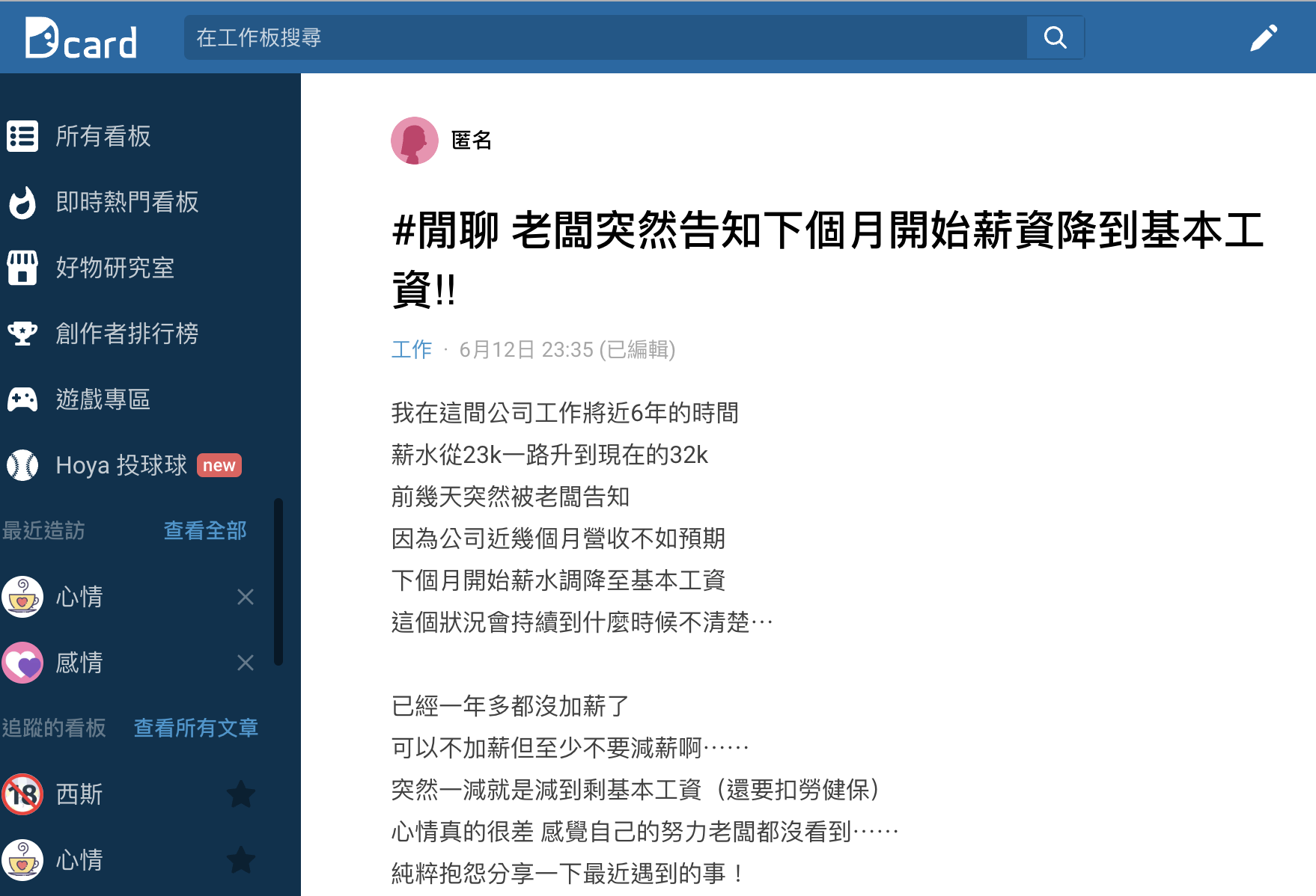 原PO在Dcard上发文,“老板突然告知下个月开始薪资降到基本工资”,在公司工作近6年的时间,薪水从原本的23K,一路慢慢往上升,到现在的32K,没想到前几天老板却突然告知,公司营收不如预期,“下个月开始薪水调降至基本工资”,不晓得这样的状况会持续到什么时候。”