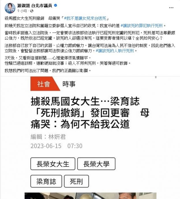 游淑慧周四在脸书发文表示,前几天她在立法院和党籍立委参选人宣示政见:“让该死的罪犯执行死刑”。