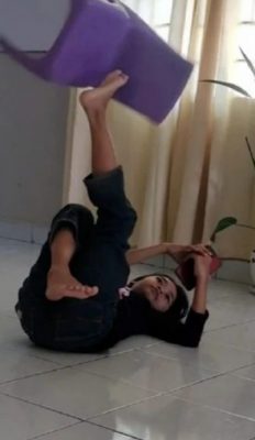 根据视频,小女孩正躺在客厅地上刷手机,期间一只脚高举一张小凳子,然后毫不费力的用脚趾在空中扭转该张凳子。