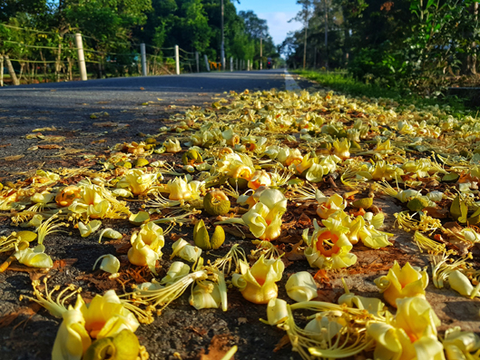 边走回家边想,自己在课堂上常提醒少年人多观察,多对生活周遭事物敏锐一些,而今的榴梿花却给我个当头棒喝——生活的繁琐忙碌几乎让我陷入“忙、盲、茫”的泥沼,运动也变成列行公事。若不是生病让这骑行路线换成健走,我也不会发现那一地的榴梿花。当让自己的脚步缓一缓,重新学习寻找生活中的美好才是。