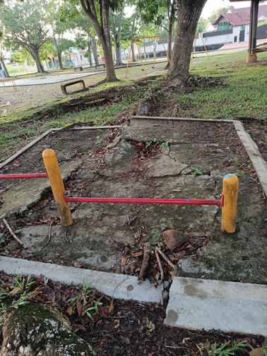 后来瘟疫爆发,行管令执行后这座公园便无人问津,我也忘了它。现在为了写这篇文章,我再次探望它。我连续去了3天,公园冷冷清清,一个人影也没有。我拿起手机,捕捉每一个角落的倩影。长得参天的树木老树盘根,凸出的树根竟然破坏小径和健身设施的地面,确实使人惋惜。地上的杂草有人修剪,公园不至于荒芜。近3天不算大的雨摧落了不少树枝。除了仰卧起坐的器材生锈,其他健身和儿童玩乐设施还能使用。公园里种了不少树木,阴凉的环境加上清新的空气,该是居民散心和运动的好地点。