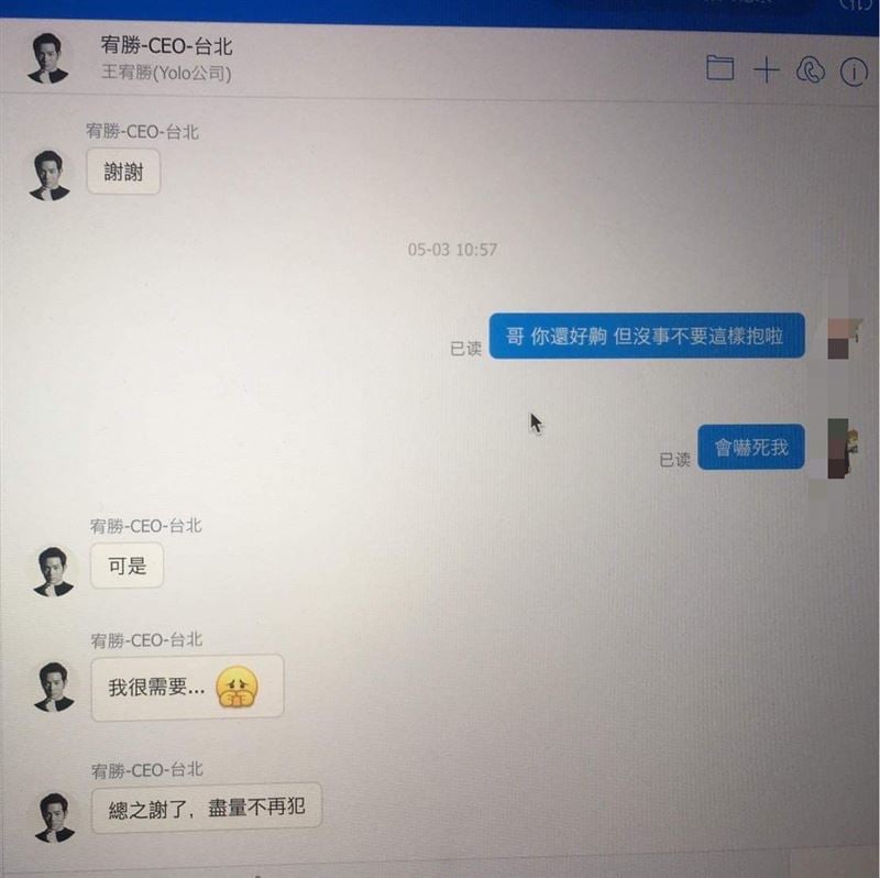 她坦言性骚新闻曝光后,宥胜传讯向她道歉,她第一时间双手在发抖、不敢点开,现在的她,只希望“能不要再见就别见了比较好”。而宥胜道歉简讯上头写着“其实我自己也被性侵过。我能懂那种世界空掉,身边的信任都一夕瓦解的愤怒和恐惧感。真的很对不起,因为我个人的冲动,竟让你要经历这样的事情,真的真的很对不起。”意图以自身经历模糊焦点,被网民炮轰“这难道是性骚别人的借口?”