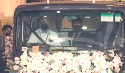 上午9时许,宝福纪念馆工人开始搬动先人照片,相信灵堂大殓仪式已经结束。灵车车头及车身,堆满粉红色、白色花。