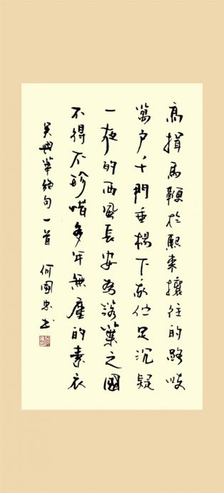 第一句化自李白〈相逢行〉最后四句:“相逢红尘内,高揖黄金鞭。万户垂杨里,君家阿那边。”在喧闹市井中偶遇朋友,挽着马鞭相互作揖问好。高楼垂杨在前,李白告别时问朋友哪一处是他家宅院。
