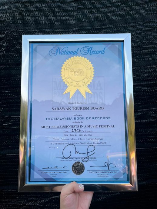 (古晋25日讯)汇集世界各国音乐团体的2023年世界雨林音乐节迈入最后一天,亦创下2763人的马来西亚最多打击乐手纪录大全。