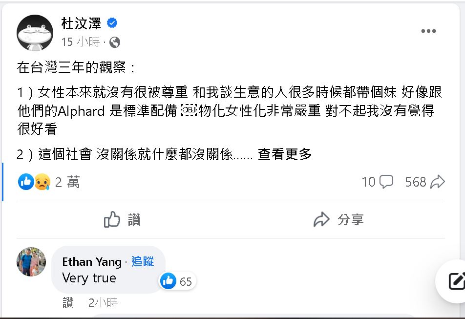 杜汶泽的发文获得不少网民认同,留言表示:“真的不懂为什么谈生意一定要带个妹”、“台湾人对于权势的畏惧给予了权势更多的力量,恶性循环”、“只是表面有民主体制,骨子里仍然非常封建、人治、落后、乡愿 ”。