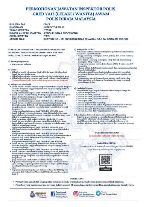 这次的警长公开招募活动由武吉阿曼行政部的招聘组负责,申请者的最低资格为学士且大马教育文凭或大马技职证书考试的国语成绩最低取得C的成绩。