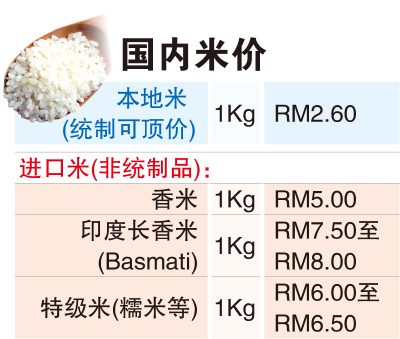 该会署理会长杨三九说,国内消费者开始增加选用进口米,主要是品质和健康考量,而进口香米没有受到统制品价格约束,米价根据市场需求浮动,目前价格略有上涨,比如香米每公斤5令吉、印度长香米(Basmati)每公斤7令吉50仙至8令吉,而特级米(糯米等)每公斤6令吉至6令吉50仙。