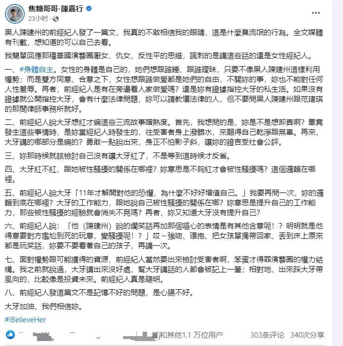 由于前经纪人的PO文中还写下“为什么你会想到他说的烂笑话再加那个呕心的表情是有其他含意呢!?”陈嘉行完全无法认同,更气炸回呛:“强吻、环抱、把女孩单独带回家、丢到床上原来都是玩笑话,你要不要看着自己的女儿,再讲一次?”其发文钓出大批网民力挺:“果然是志同道合,不是一家人,不进一家门”、“提油救火的前猪队友!逻辑都是把受害者抹烂,但是受害者再怎么烂,加害者也不会是对的”。