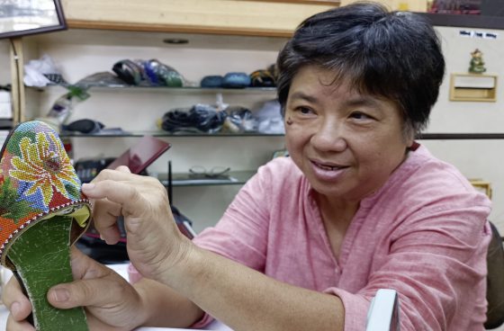 林天成制作娘惹鞋的手艺源自母亲,当时10岁的他先从分类珠子的颜色学起,“母亲给我一支针,要我从混色的珠子中找出需要的。”几个月过去,他的母亲增强任务难度,要求他将鞋面小部分的空白处缝上。这对10岁儿童来说看似艰难的任务,林天成当下却欣然接受,“平日我都会观察她怎么做,自然而然也会。但我缝完后母亲就笑了,我也不明白她笑什么,又跑去玩了。”