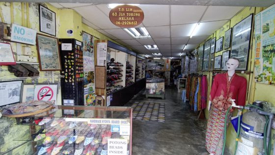 林天成与侯凤莲夫妇俩经营的娘惹珠子鞋(以下简称“娘惹鞋”)店铺,距离热闹的马六甲鸡场街稍有距离。写着“T.S Lim Trading”的木色牌匾挂在入口处,稍微不注意便会错过。走入店内,架子上摆放一双双设计独特的娘惹鞋,在墙的另一边则贴着一幅幅未制成鞋的鞋面。