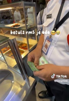 视频中,一名外劳保安在嘛嘛档打包食物,网民看到该保安只有5令吉,并提出疑问,“5令吉可以吃什么?白饭和酱汁吗?“