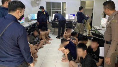 (曼谷7日讯)泰国一个外国团伙租下北榄府一栋豪华别墅掩人耳目,在里面开设网络赌场以及伪造假护照和签证章,移民局接报后集结警力围捕,逮获17名外籍人士,缴获大量赃物,而他们背后的真正金主是中国人,该团伙刚从邻国转移到泰国一个多月,目前警方正在进一步扩大调查。