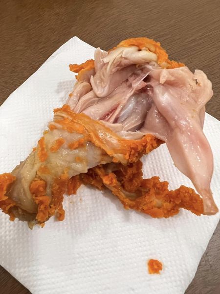他在爱follwing脸书专页上上传照片,展示他打包回来吃了几口的炸鸡腿肉呈粉红色,一些肉还黏着骨头,明显鸡肉还是生的。