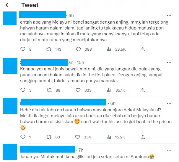 一名网民事后在推特发布视频,注明事件是在昨晚8时38分于槟城发生,一只狗狗在穿过甘榜街道时,因光线不足而被疾驶而过的摩托车撞及,腿受伤后跑到排水沟里躲起来。