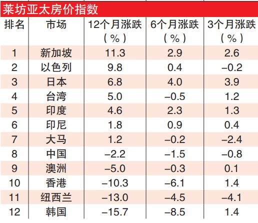 新加坡在亚太市场中表现亮丽,房价常年涨幅达11.3%。莱坊说,新加坡政府最近提出的税收政策主要针对海外买家,以冷却不断上涨的房价,幸而新加坡国内买家仍不少,预期房价可能会改写新高。