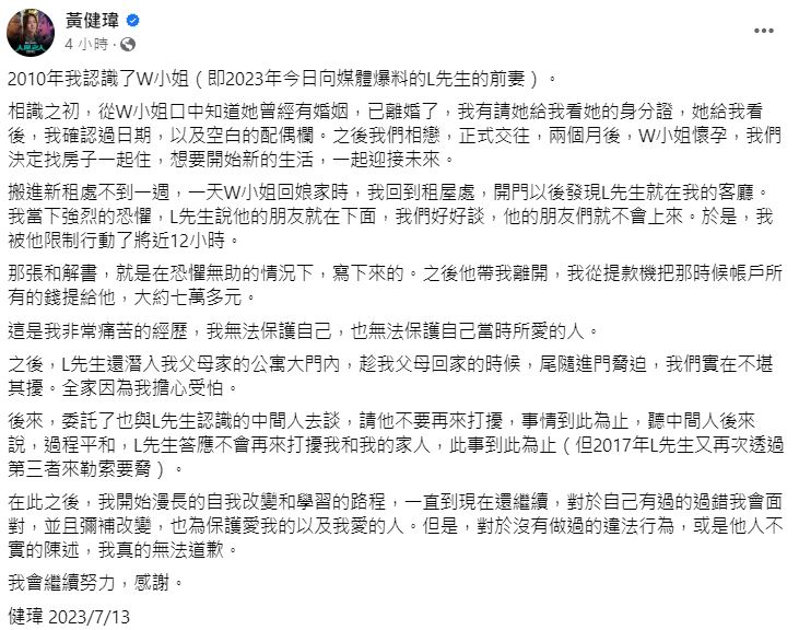 黄健玮更于今天凌晨3时许在脸书发文自清,当时他确认W小姐配偶栏上是空白的,两人才开始交往,2个月后对方怀孕,便想一起开始新生活。但后来L先生找上门,“我被他限制行动了将近12小时。”最后他给对方7万台币(约1万令吉),并写下那张和解书。但后来L先生甚至“潜入我父母家的公寓大门内”,才找了“中间人”去谈,L先生才承诺不再来打扰。