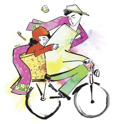 转眼阿鹿长大成漂亮的少女,开始注重外表和衣服花式。那时,有个售货郎,每个礼拜都会在她屋前的空地叫卖。售货郎骑着脚踏车,货物堆满车斗,有盘碗、扫帚,有牙膏、爽身粉,有腹泻散、退烧药,日常用品应有尽有。阿鹿问他可有花布?有无蓝绿色碎花的?售货郎看了这姑娘,说:你那么年轻,怎么喜欢蓝绿色的花布?穿红色和黄色的花布不是比较漂亮吗?阿鹿说,我比较喜欢蓝绿色。售货郎说好,我下礼拜给你带来。下星期,售货郎果然找来了几块蓝绿色花布,阿鹿很欢喜。那售货郎叫阿汀,过后阿鹿要什么,就跟阿汀说,第二个礼拜阿汀总能给她办到。