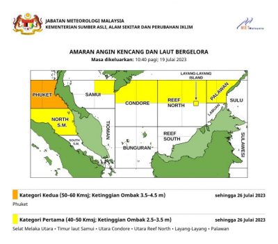 气象局在早上10时40分发文告说,当局已向普吉岛海域发布第二级警报,强西风时速将达50至60公里,以及浪高4.5公尺。