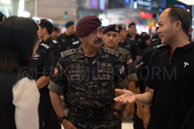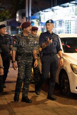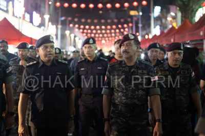 (吉隆坡22日讯)全国总警长丹斯里拉沙鲁丁率领一众高级警官,于昨晚走访吉隆坡柏威年广场附近的武吉免登路及阿罗街,促进警民之间的互动。