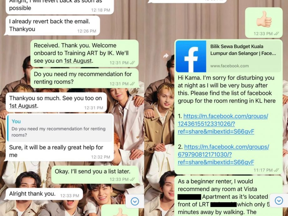 据英丹上传的Whatapps对话截图,她询问对方在实习期间是否需要租房?