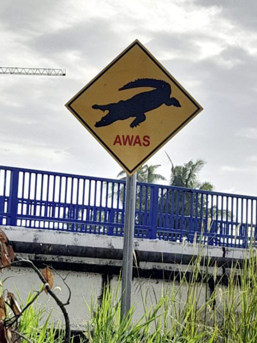 我家附近有条河,河岸多处立着一幅幅画着鳄鱼图片的亮黄色告示牌,提醒民众小心河里有鳄鱼。