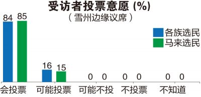 民调指出,雪州34个边缘议席的选民投票意愿很高,84%各族的受访选民表示肯定会在8月12日前往投票,另16%则表示可能会投票。