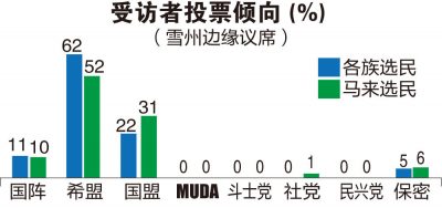马来受访选民方面,52%表示会投希盟、31%投国盟、10%投国阵、1%投社会主义党、6%不愿透露。