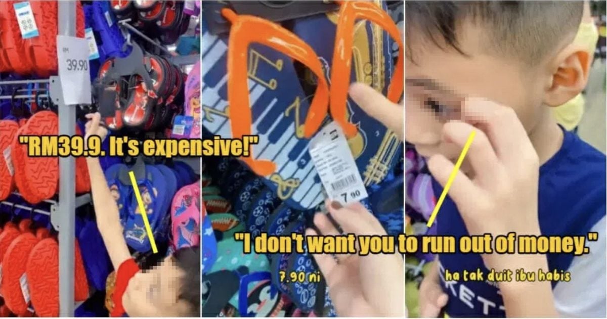 视频中,孩子的母亲原本看中一双款式较为出众,价格39令吉90仙的拖鞋,然而孩子展现出一脸苦相,不是因为不喜欢拖鞋的款式,而是嫌价格太贵,因为他不舍得母亲为他破费,反而选择了只有7令吉90仙的拖鞋。