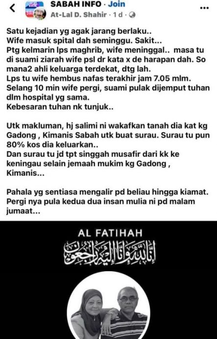 然而,网民们透过评论区的讯息了解到,已故萨利敏在亚庇沙巴妇女儿童医院(HWKKS)探望妻子时,听到妻子去世的消息后,不久也倒地不起。