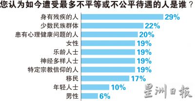 益普索在本月发布的“大马人对平等的态度”调查显示,在问及受访者,如今遭受最多不平等或不公平待遇的人是谁,29%认为是身有残疾的人、22%认为是少数民族群体、20%认为是患有心理健康问题的人。