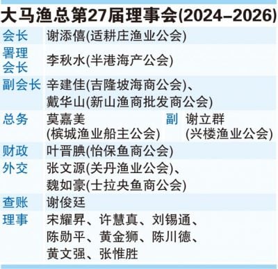 (吉隆坡12日讯)马来西亚渔业总会总会长谢添僖冀望,渔总未来除了多与政府部门机构配合,提升及扩大国内的渔获销售市场;也能通过渔总带领商家到国外,寻找更多商机及开拓海外销售渔获的新市场,为同业创造更多新的业务开发良机。