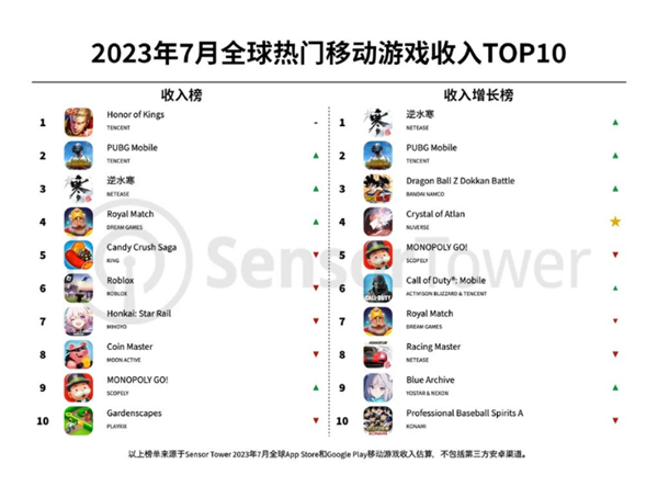 数据显示,腾讯的《PUBG Mobile》也以1.72亿美元收入重回榜上第2名,其中合并了《和平精英》收入;而网易《逆水寒》手游以1.13亿美元收入位列榜单第3名。
