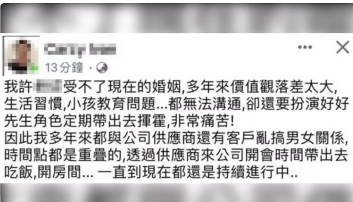 这名已婚的许姓处长在脸书上爆料,因为多年来价值观落差太大,受不了目前的婚姻,一直以来都与公司供应商、客户乱搞男女关系,且时间多有重叠,直到现在仍在持续进行。