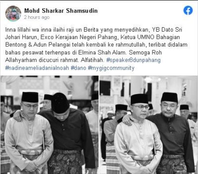 (文冬17日讯)彭亨州议长拿督斯里莫哈末沙卡证实,小型飞机疑失控坠毁酿成多人不幸丧命的悲剧,机上其中一位乘客是彭亨州行政议员拿督斯里佐哈里哈伦。