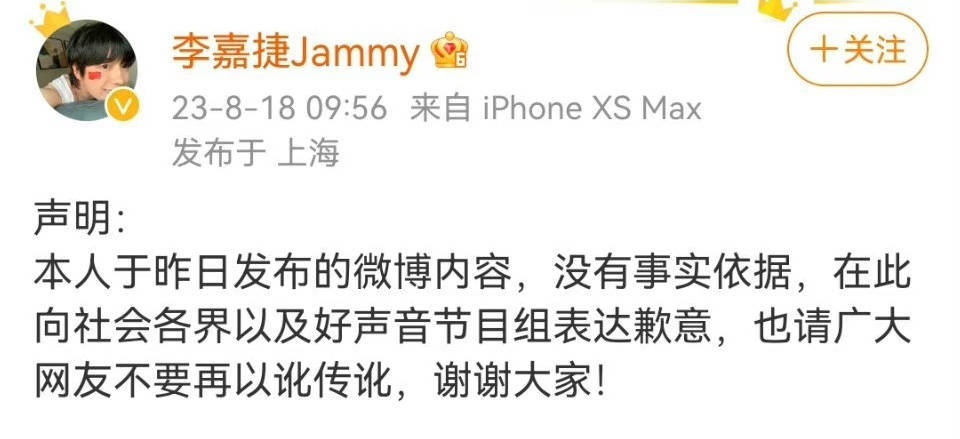 岂料,李嘉捷18日早上突然发文道歉:“本人于昨日发布的微博内容,没有事实根据,在此向社会各界以及好声音节目组表达歉意,也请广大网民不要再以讹传讹,谢谢大家!”又再次掀起网民的怒火。