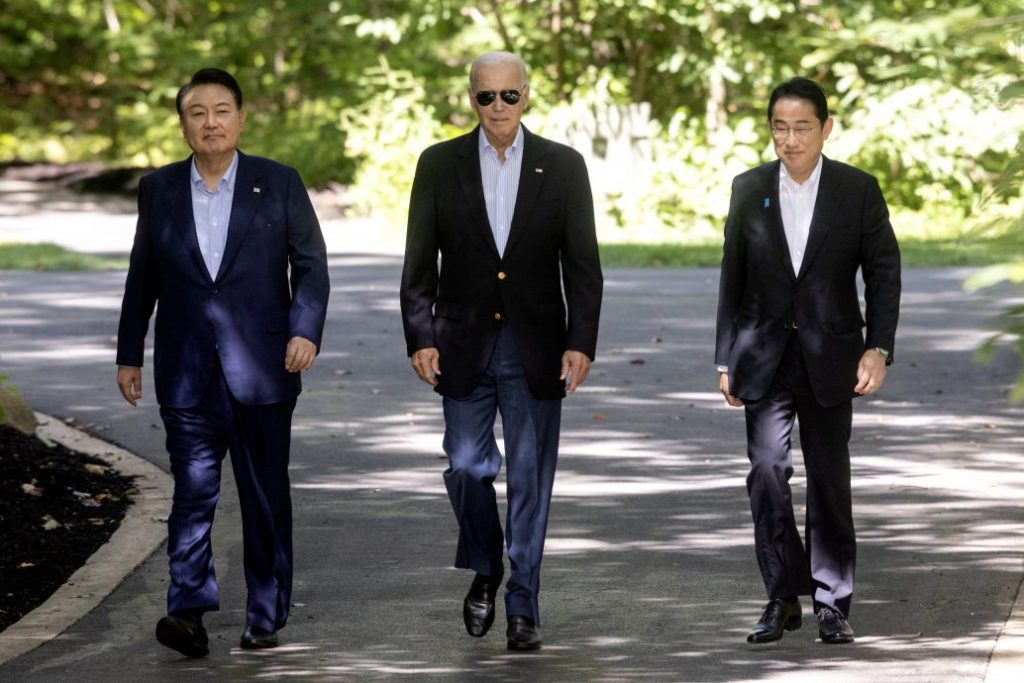 美国总统拜登、日本首相岸田文雄和韩国总统尹锡悦18日在美国马里兰州大卫营举行了历史性会晤,这是美日韩三国领袖首次单独举行会议。分析家表示,对印太平洋地区安全的担忧,尤其是在中国和朝鲜不断炫耀武力,加速了美国盟友──日本和韩国之间的关系迅速回暖。